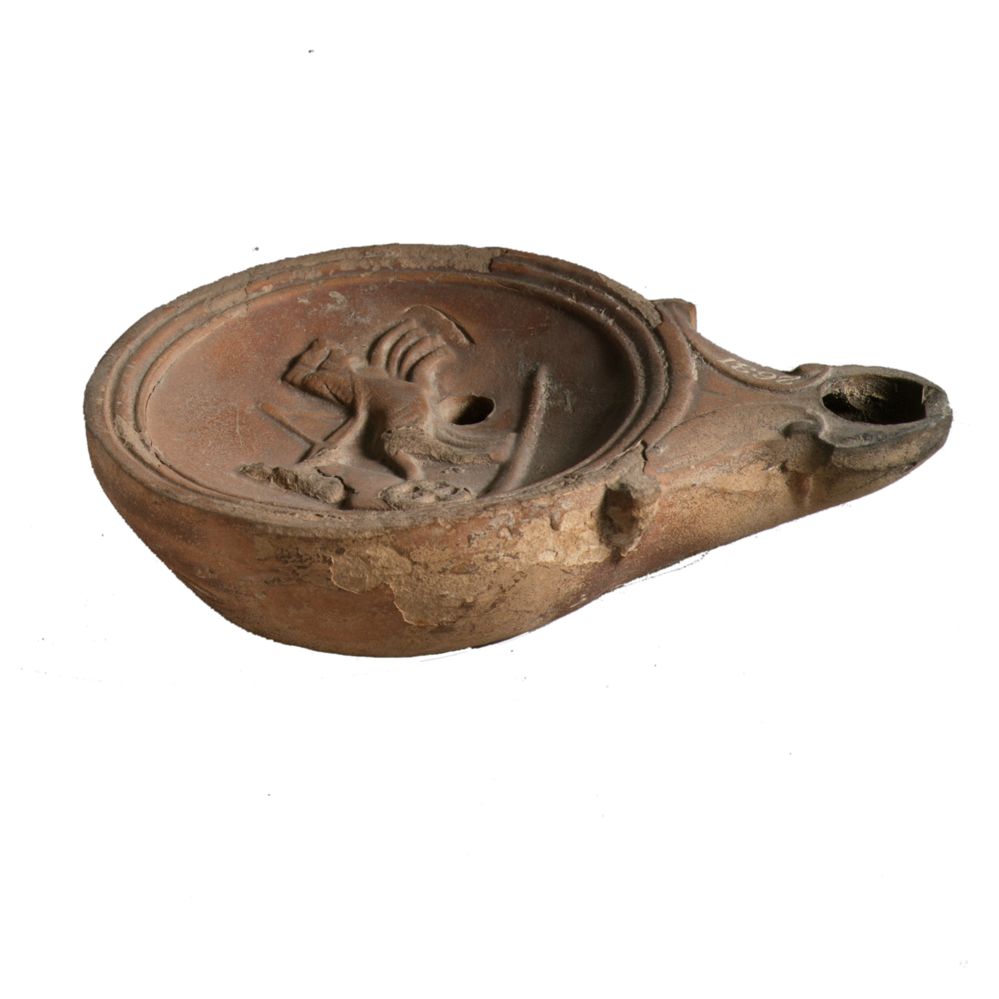 This ceramic oil lamp is decorated with a charioteer driving a two-horse chariot.